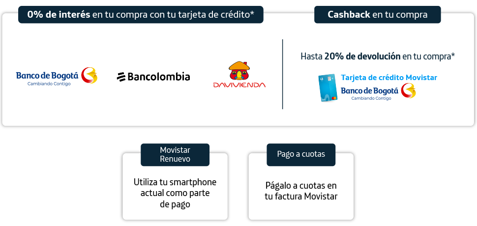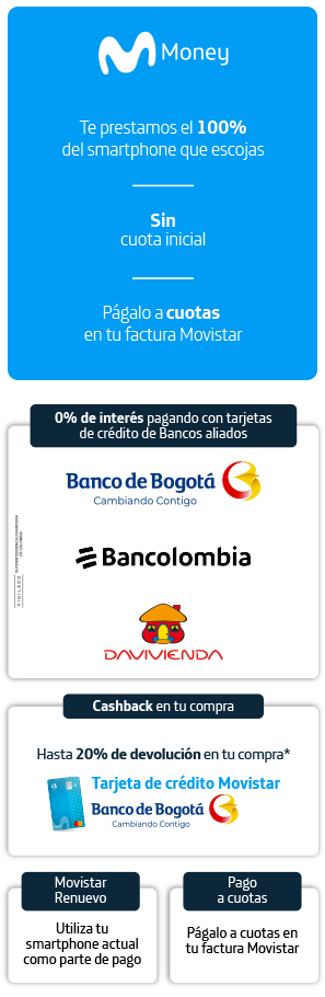 Oferta valida desde 1 al 31 de diciembre del 2022, Devolución de hasta el 20%: Aplica para nuevas Tarjetas de Crédito Movistar - Banco de Bogotá solicitadas y aprobadas en los Centros de Experiencia Movistar autorizados que realicen la primera compra el mismo día de aprobada la Tarjeta por montos iguales o superiores a $299.000. Devolución máxima de $400.000 que se verá reflejada en el extracto de la Tarjeta durante el mes siguiente luego de finalizado el mes de la compra. También aplica para Tarjetas de Crédito Movistar nuevas y entregadas a través de otros canales de venta autorizados del Banco de Bogotá diferentes a los Centros de Experiencia Movistar. La compra deberá realizarse en los Centros de Experiencia Movistar autorizados y en www.movistar.com.co máximo a los 30 días calendario después de la activación de la Tarjeta de Crédito Movistar.